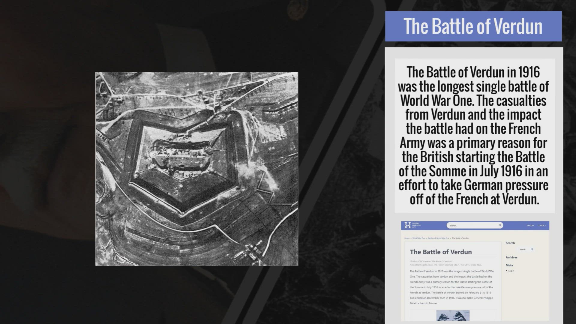 The Battle of Verdun in 1916 was the longest single battle of World War One. The casualties from Verdun and the impact the battle had on the French Army was a primary reason for the British starting the Battle of the Somme in July 1916 in an effort to take German pressure off of the French at Verdun. The Battle of Verdun started on February 21st 1916 and ended on December 16th in 1916. It was to make General Philippe Pétain a hero in France.