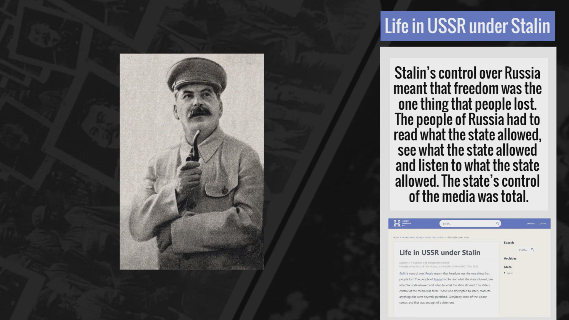 Stalin’s control over Russia meant that freedom was the one thing that people lost. The people of Russia had to read what the state allowed, see what the state allowed and listen to what the state allowed. The state’s control of the media was total. Those who attempted to listen, read etc. anything else were severely punished. Everybody knew of the labour camps and that was enough of a deterrent.